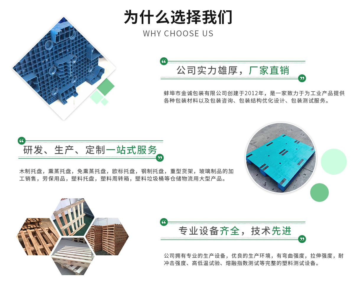 蚌埠市金誠包裝有限公司創(chuàng)建于2012年,是一家致力于為工業產品提供各種包裝材料以及包裝咨詢、包裝結構優(yōu)化設計、包裝測試其中包括木制托盤,熏蒸托盤,免熏蒸托盤,歐標托盤,鋼制托盤,重型貨架,玻璃制品的加工銷售,勞保用品...